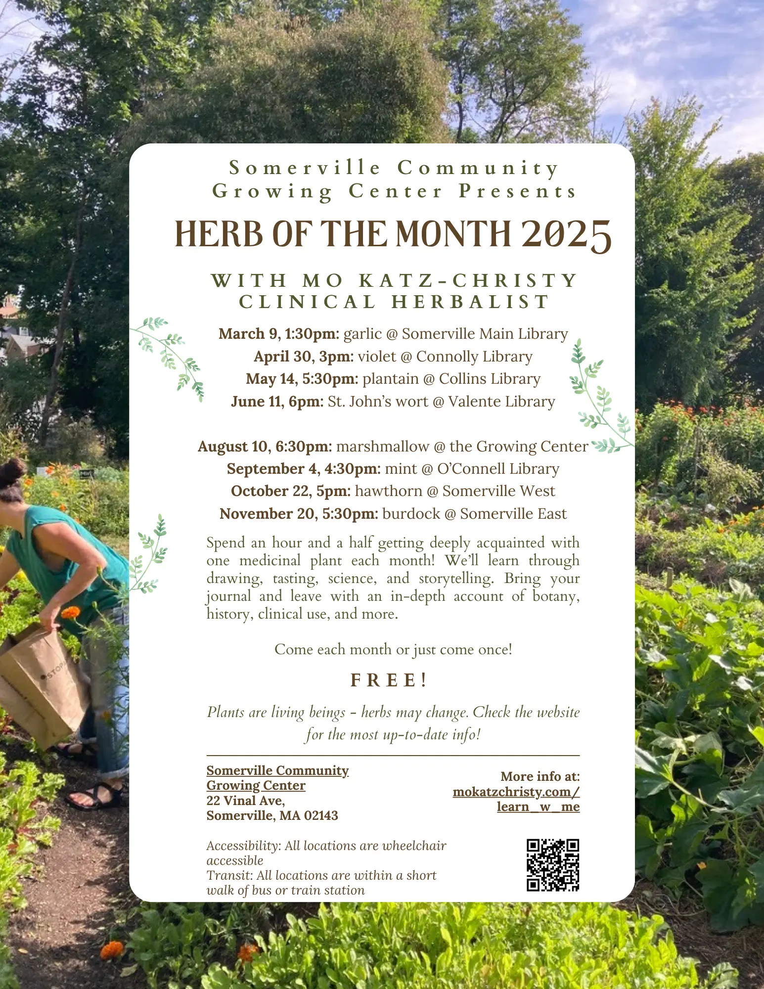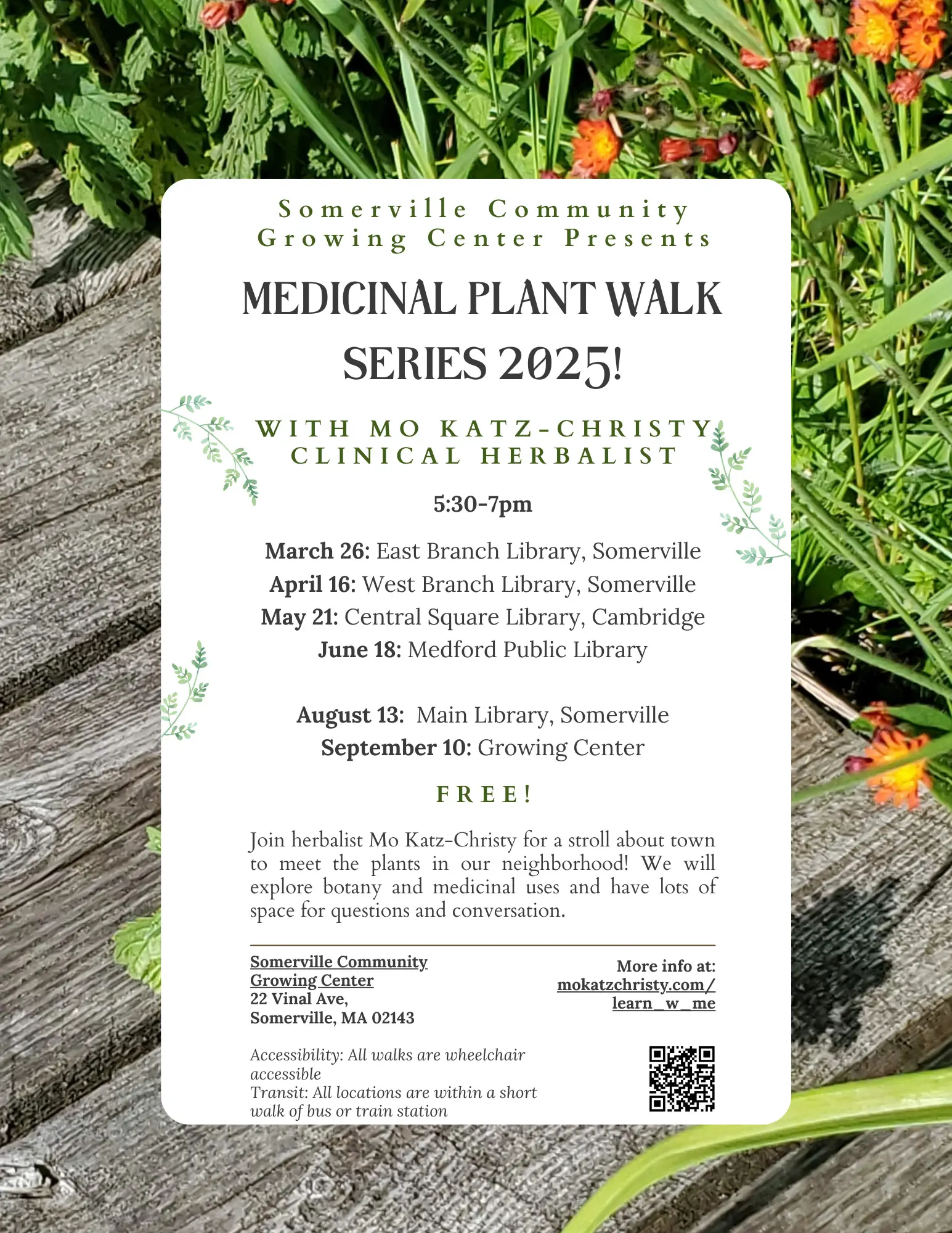 Let’s welcome fall by exploring the wonder of wild weeds! Join clinical herbalist Mo Katz-Christy for a stroll along the Community Path to learn about the medicine, botany, and magic of medicinal herbs. We will ask, what does it mean to look towards our local plants for medicine, especially when our soils are contaminated and invasive plants abound? What does it mean for a plant to be a “weed”, and where do humans belong in relationship to our ecosystem? We will discuss the bounty of medicinal plants in Somerville and their specific indications and properties. Bring a notebook and get ready to scribble fast as we delight in the bounty of our neighborhood!